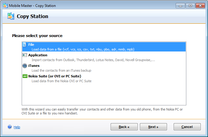 Import the address book(s) from any applicataion Mobile Master supports, such as Outlook, Thunderbird, Tobit David, Novell Groupwise and transer the contacts to e.g. your new iPhone or Android smart phone or Windows phone handset.
