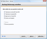 This backup function makes your work easier: using an assistant, Mobile Master creates a complete backup of your cell phone/smartphone data (e.g. address and phone books, Organizer, notes).