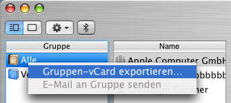 Öffnen Sie das MAC Adressbuch und klicken mit der rechten Maustaste (bzw. Strg+Maustaste) unter Gruppe auf 'Alle', und wählen dort 'Gruppen-vCard Exportieren...':